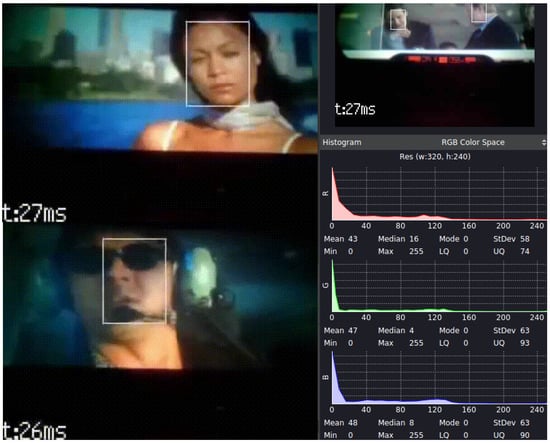 Part of the commercially available chips examined are a compilation of RISC-V and proprietary CPU, coprocessor, and accelerator cores. Therefore, the performance metrics collected cannot be fully assigned to RISC-V cores and they were not considered further in the evaluation. More notable examples are the ESP32-S2 [53] and K210 [54]. A RISC-V based co-processor supporting the RV32IMAC ISA extension together with a proprietary main processor IP are embedded in the ESP32-S2. K210 has a dual core 64-bit RISC-V MCU core, which complies with RV64IMAFDC ISA extension and has also a neural network processor (NPU) with a 0.8 TOPS claimed performance. In Figure 1, snapshots from a face detection inference demo running on K210, using a pre-trained AI model [55], is shown.
