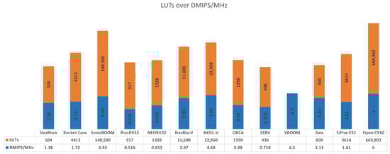 In Figure 2, a data correlation between the hardware synthesis LUTs utilization and the performance, in terms of DMIPS/MHz, for the RISC-V cores, is visually illustrated. Typically, for high performance cores, high resource utilization is also inferred. VROOM core achieves the best performance, but no design details have been provided to highlight the use of hardware resources required to reach it. From the results, however, it is also formulated that some implementations can achieve higher performance and LUTs utilization ratio. This performance efficiency metric has been evaluated for all the RISC-V implementations. The most efficient RISC-V implementation in our study has been the ibex core, followed by VexRiscv and SERV; ibex has the second highest BRAM utilization, however.