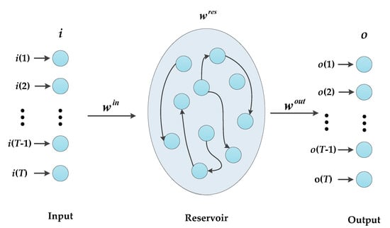 where , and  denote the input, intermediate and output weight matrix, respectively; i(t) and r(t−1) express the time series input and the reservoir state at step t−1, respectively;  and  are randomly initialized and fixed;  can be calculated by Equation (4), SR is the spectral radius of ,  is the maximum eigenvalue of the matrix W and the elements of W are generated randomly in [−0.5, 0.5].