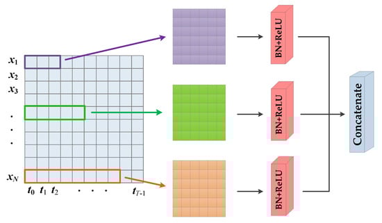 On the one hand, we employ multiple scales of 1D CNNs for convolution operations along the time direction and use multiple filters for each time scale. The batch normalization operation follows the convolution operations to avoid the gradient disappearance problem. Next, ReLU as a correction layer for the activation function is adopted, which can improve the nonlinear and sparsity connection between the levels to reduce over-fitting. Therefore, batch normalization and ReLU can achieve more robust learning. Finally, the multi-scale features are concatenated into a new feature. The structure diagram of a multi-scale 1D convolution is shown in Figure 3.