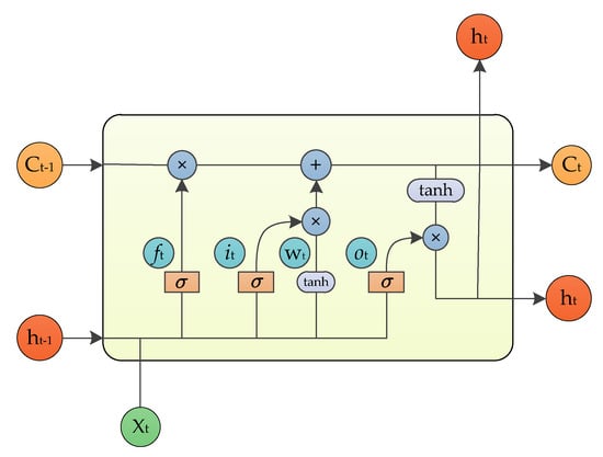 where σ defines as the logistic sigmoid function, and symbol  represents the element-wise multiplication. The recurrent weight matrices are depicted using the notations Wf, Wi, Wo, and Ww. The deviation is depicted using the notation bf, bi, bo and bw. The diagram of the LSTM model is shown in Figure 4.