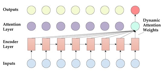 where  denotes the j-th hidden state vector of the encoder and  denotes the hidden state of the decoder at the previous time step. The term  is a scoring function and used to calculate the similarity between  and . Figure 5 depicts the attention model diagram. There are two advantages to using the AM. First, AM can apply various weights to distinct echo state representations of the same time step. In other words, AM can give more weight to information that is more significant for categorization while suppressing irrelevant data. Second, including the AM increases the model’s running speed.