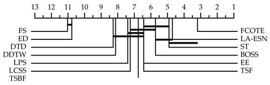 We compare the proposed LA-ESN model with the traditional TSC models to conduct a general evaluation. In this work, we selected 12 conventional models as comparison methods and abbreviated them as ED [], DDTW [], DTD [], LS [], BOSS [], EE [], FCOTE [], TSF [], TSBF [], ST [], LPS [], and FS []. We briefly describe each comparison method as follows: