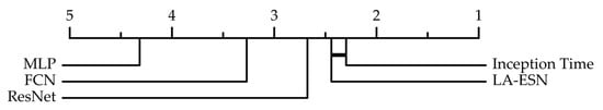In this section, we compared the LA-ESN model with four deep learning classifiers: MLP [], FCN [], ResNet [] and Inception Time []. The following is a brief description of the four deep-learning comparison methods mentioned above: