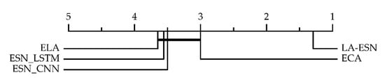 In this subsection, a step-by-step exploration has been constructed further to verify the validity of the proposed LA-ESN model. We divided the model into four modules: ESN-LSTM, ESN-CNN, ESN_LSTM_ATT (ELA) and ESN_CNN_ATT (ECA), and conducted experiments on 17 datasets. These four methods first employ the ESN to perform representation learning on time series and then use different classifiers such as LSTM, CNN, LSTM with attention (LSTM_ATT) and CNN with attention (CNN_ATT) to extract feature information from the representation. In order to verify the validity of each module, a unified setting is adopted for the parameters. In ESN, the spectral radius SR is 0.9, the input cell scale IS is 0.1, the reservoir sparsity SP is 0.7, and the size of the reservoir is 32. The epoch of the whole experiment is 500, and the batch size is 25. LSTM_ATT can automatically record long-term temporal dependencies of sequences, and CNN_ATT can extract feature information from different scales. LA-ESN combines both advantages to extract more valuable information from datasets and achieve better classification accuracy. Table 4 displays the outcomes of LA-ESN and four distinct classifiers on 17 datasets. On 13 datasets, it can be seen that LA-ESN produces the best results. At the same time, we build the critical difference diagram shown in Figure 8.