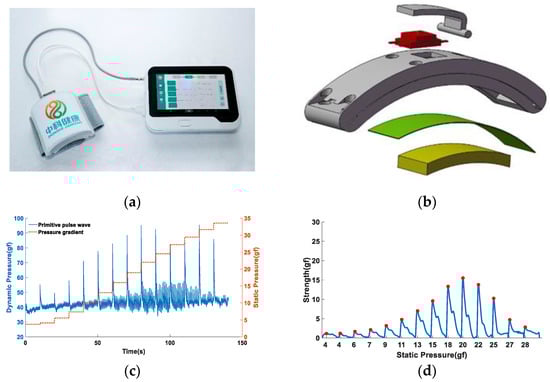 Pulse data acquisition equipment and signal acquisition diagram: (a) multi-channel pulse diagnosis equipment, including a wristband data collector and a display storage device; (b) composite sensor construction; and (c) raw pulse signal. The solid blue line represents the pulse signal, where the spike is due to the pressure pulse at the beginning of pressurization, and the signal we use is the signal when the pressure is flat, so it has no effect on the result. The orange dashed line indicates the pressure gradient. (d) Single-cycle pulse signal under continuous stress sequence.