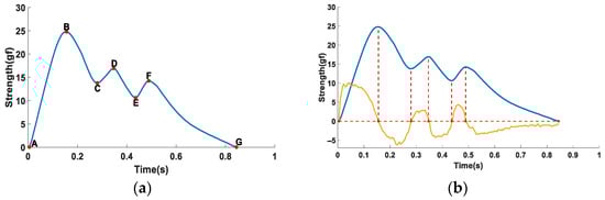 A pressure pulse wave signal is produced due to periodic ejection of the heart, so the pulse waveform characteristics are closely related to the ejection mechanism of the heart. The typical single-cycle pulse waveform is shown in Figure 2a. According to traditional Chinese medicine theory and related references [], the time-domain feature points of single-cycle pulse waves can be explained by the following 7 feature points, as shown in A, B, C, D, E, F, and G in Figure 2a. A–G represents a complete ejection cycle of the heart, A–E is the systolic process, and E–G is the diastolic process. A complete single-cycle pulse wave can be broken down into the following steps: