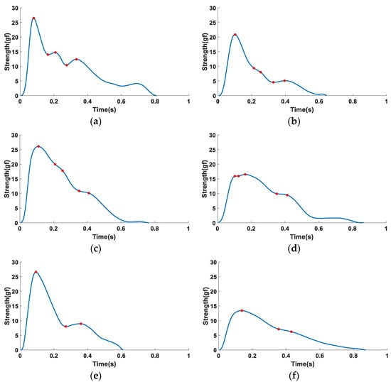 Secondly, due to the diversity of pulse morphology across different physiological individuals, the collected pulse waves were divided into 6 categories according to morphology so as to facilitate the unified labeling of feature points, and the specific morphological characteristics of the 6 types of waveforms are shown in Figure 4. Among them, the morphological characteristics of the first type of pulse wave are shown in Figure 4a, which has the morphological characteristics closest to the typical single-cycle pulse wave and manifests as three clear characteristic peaks. The morphological characteristics of the second type of pulse wave are shown in Figure 4b, which has two peaks and a curved inflection point, and the curved inflection point is located between the two peaks. The morphology of the third type of waveform is shown in Figure 4c, which has only one peak and two more obvious curve inflection points after the peak appears. The morphological characteristics of the fourth type of waveform are shown in Figure 4d, which has two peaks, and the height of the second peak is greater than the height of the first. The morphology of the fifth type of waveform is shown in Figure 4e, which has only two peaks and no other significant feature points. The morphological characteristics of the sixth type of waveform are shown in Figure 4f, which has a peak and a curved inflection point and no other significant feature points.