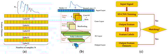 1D-CNN algorithm design process: (a) generation of feature datasets; (b) 1D-DCNN model training; and (c) 1D-CNN model testing.