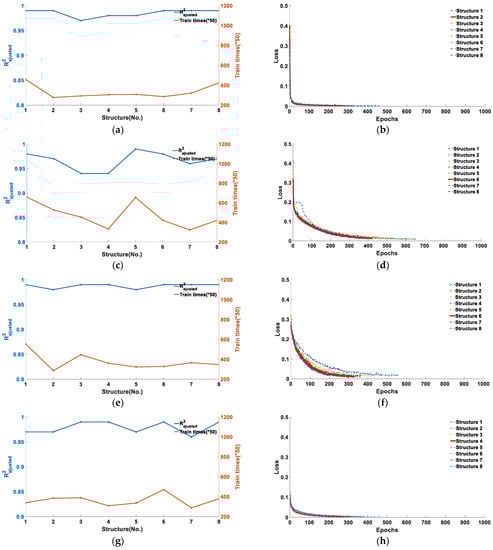 To prevent the model from falling into local optimum, we randomly shuffled 1300 one-dimensional pulse wave signals, and 70% of them were used as the training set (a total of 910 single-cycle pulse signals), and 30% of the samples were used as the test set (a total of 390 single-cycle pulse signals). Taking the five feature points corresponding to the pulse signal as the training label, eight different network structures were applied to the training of the five feature point training sets. The model training results obtained are shown in Figure 6.