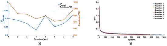 Training results for five types of feature points under eight network structure models: (a)  and training number of feature point B; (b) the loss function of feature point B; (c)  and training number of feature point C; (d) the loss function of feature point C; (e)  and training number of feature point D; (f) the loss function of feature point D; (g)  and training number of feature point E; (h) the loss function of feature point E; (i)  and training number of feature point F; and (j) the loss function of feature point F.