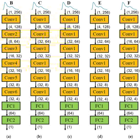 As shown in Table 3, we designed eight 1D-DCNN model structures. Among them, the Conv layer has six layers, and the structure of each layer is (a–b), where (a) represents the input channel, and (b) represents the output channel. The FC layer has two layers, and the structure of each layer is (c–d), where (c) represents the number of input features, and (d) represents the number of output features. The number of network training times is determined by setting the loss function threshold. When the loss function threshold condition is reached, fewer training times means less network training time. The loss function threshold condition set in this study was as follows: when the loss function output value of the network does not decrease for 30 consecutive times, the network is considered to have been trained. The training is stopped, and the final network model is output. Table 4 describes the model parameters.