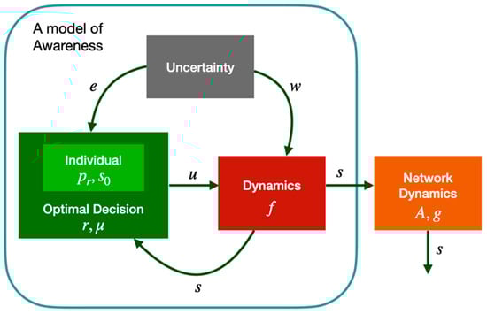 A mathematical model grounded on MDPs describing the basic elements which impact the individual’s reasoning and analyzing how they are related to the process of increasing personal awareness is shown in Figure 1, which reports a graphical scheme of the mathematical model where the individual mechanisms introduced in [,] (green border sub-scheme), and the networked system of interconnected individuals (complete scheme) are highlighted.