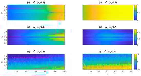 Figure 2 shows, before anything else, the effect resulting from the application of the aware policy in terms of a high final level of the state (near 1) starting from a low state (Figure 2a) and speed in reaching the maximum state level starting from a high initial state (Figure 2b). The shift from a habitual to an aware policy has an improving action on the dynamics of the state (Figure 2c,d), except when the initial level of awareness is high enough (see Figure 2d, where ) and after a long time horizon (the similarity at the first time instant in Figure 2c,d is due to the equal initial state assumptions). The benefit of the shifting increases as the grows from zero to 0.5 where there is a discontinuity for which the difference between the two situations is neglectable, and then symmetrically decreases as the grows further from 0.6 to 1. This fact is due to the symmetrical form assumed for the theoretical probability functions defined for an analytical and intuitive individual, as expressed in Equations (8) and (A1), respectively. In the end, the two panels e and f highlight how the improvement of the state dynamics not necessarily corresponds to an increase in the reward, , because the model considers also a part of costs related to the level of analyticity adopted in the decision so that an individual can reach a high level of the state but can also have some losses simply indicating a high cost due to excessive use of analytic reasoning.