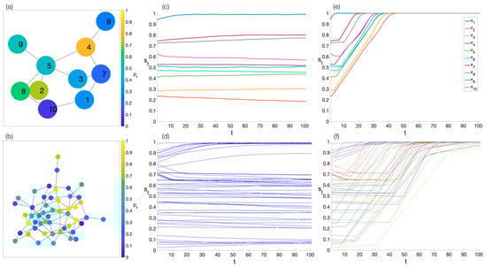 State evolution in a network of 10 and 50 individuals. Panels (a,b): in both the 10 and the 50 nodes cases, the graph topology is Erdős–Rényi with an average degree of 4. The colors indicate the value of the reasoning propensity () for all nodes, uniformly distributed in the open interval (0, 1). The same is done for the initial state, which is uniformly distributed in the open interval (0, 1). State dynamics without panels (c,d) and with panels (e,f) interactions among individuals. The synchronization parameters are and there is included the presence of emotions. All the other parameters are .