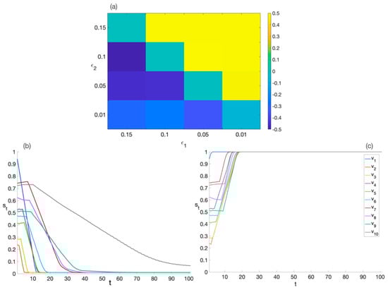 Different combinations of the coefficients and , which weigh the interactions, have been analyzed (see Figure 4a), highlighting the different pairs that can provide a worsening or an improvement of the state evolution. We note how similar parameters’ values have very different effects, defining a diagonal of the matrix; pairs with helpful influences () are positioned above the diagonal, whereas pairs with harmful influences () are below it.