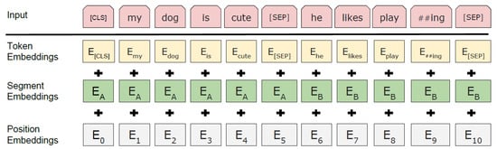 Since BERT can handle a variety of downstream tasks, the input representation is able to unambiguously represent both a single sentence and a pair of sentences (e.g., ⟨Question, Answer⟩) in one token sequence. A “sequence” refers to the input token sequence to BERT, which may be a single sentence or two sentences packed together. In order to define an input and output representation, at first WordPiece embeddings [30], with a 30,000 token vocabulary, is exploited. Next, two custom embeddings are implemented. The first token of every sequence is always a special classification token ([CLS]). The final hidden state corresponding to this token is used as the aggregate sequence representation for classification tasks. Furthermore, sentence pairs are packed together into a single sequence. They differentiate the sentences in two ways. First, they separate them with a special token ([SEP]). Second, they add a learned embedding to every token indicating whether it belongs to sentence A or sentence B. For a given token, its final input representation is constructed by summing the corresponding token, segment, and position embeddings. A visualization of this construction can be seen in Figure 3.