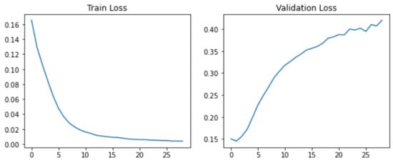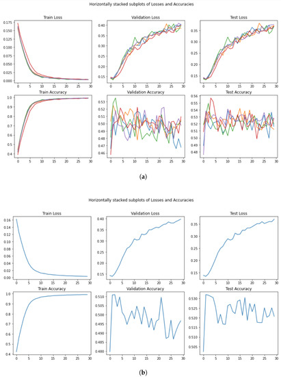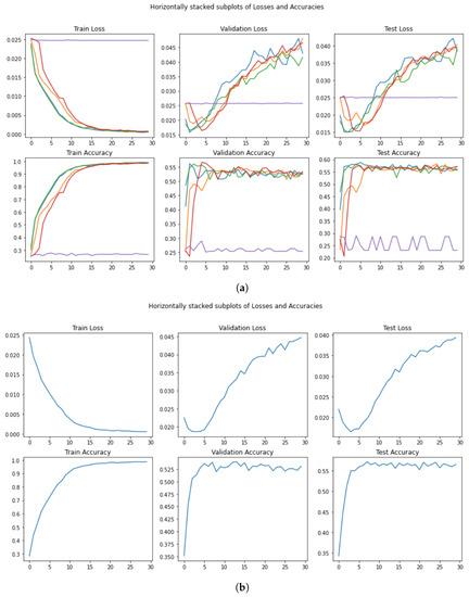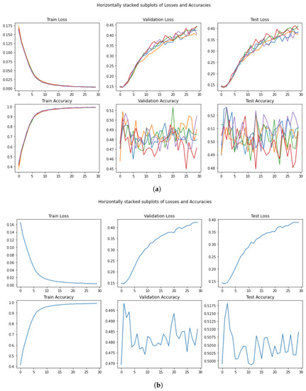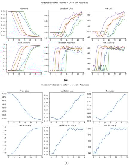 In this sense, the result achieved in our experiments (see Figure 15a,b), showing an accuracy on the test set of , is comparable to the number that we can see in the original figure. As an additional comment, we want to highlight the fact that even with a 30-epoch training, our outperforms all the other models exploited in the experiment, with an accuracy score of . Moreover, also with this model, we witnessed abnormal stationary behavior identical to what was found for .
