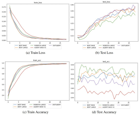 However, even if the GPUs were used, there were some problems regarding a pair of BERT models. In the examined paper, 1 of the 5 models, namely , in fact has a huge number of trainable parameters (355 M). This is such a high number that their processor, despite the fact that it was a GPU, could not handle it due to its lack of computational capacity. Therefore, they decided to use Google Colab, a product from Google Research (https://colab.research.google.com (accessed on 19 January 2023)). Colab is a hosted Jupyter notebook service that requires no setup to use, while providing access free of charge to computing resources including GPUs. Its cloud-computational processors fixed the problem and allowed them to complete the experiment. In the same way, our hardware, even if more powerful than theirs, was not effective enough in order to deal with that kind of architecture and an additional machine was necessary for training the model. Regardless, what is strange is that our GPU should manage more complex architectures but controversially, we were not able to train another model in addition to RoBERTa, . It seemed like 340 M parameters were still too much to handle. Actually, there is only a 15 M difference between the two models, but it is not understandable without further information how they managed such a model.