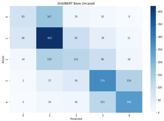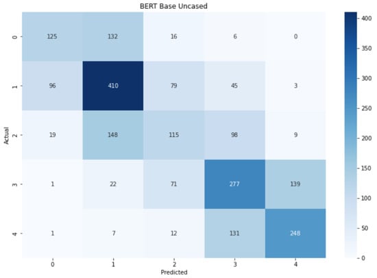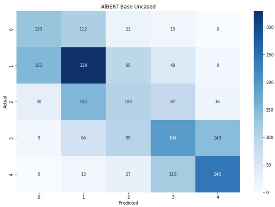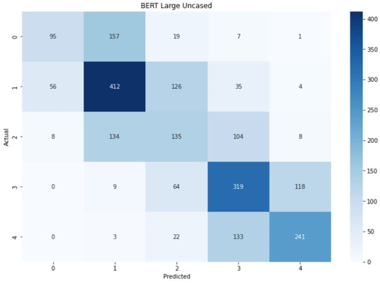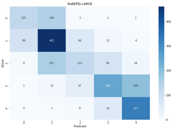 The pattern shown by the confusion matrix for (Figure 14) is very similar to the ones for and AlBERT. The extreme labels and the central labels form 3 intersecting clusters in which the labels can be identified as other classes existing in the current cluster. Despite this situation, there is still a darker diagonal that implies an overall correct prediction through all the classes, with peaks in labels 1, 3, and 4.