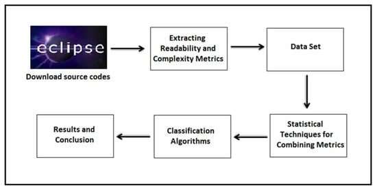 Figure 1 presents the research methodology flowchart. First, we downloaded Java source code files by utilizing Eclipse, which is a well-known software development environment and open-source software. We then extracted various software metrics from these source code files, which were related to software readability and complexity. After that, we built our data set. In the next step, we applied some statistical techniques proposed in this paper to combine the readability metrics or complexity metrics into a single variable for further analysis. Then, we used analysis methods and data mining techniques, including machine learning algorithms, to test several research hypotheses. Finally, we discussed the results and presented our contribution. The later sections briefly explain the processes for the research work.