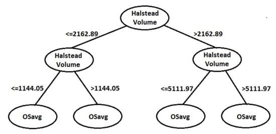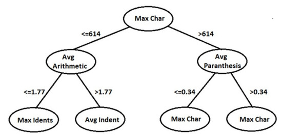 From this case study, we captured the software complexity’s influence on the readability of code. It is intuitive as the readability reflects many attributes, including code structure and density. Thus, there must be an overlap between those attributes. The experiment confirmed the H0 hypothesis, which claimed that software complexity had an influence on the readability of code, and proved the invalidity of hypothesis H1, which claimed that software complexity had no influence on the readability of code. Moreover, the results indicated that software complexity affected code readability with 90.01% accuracy using a decision tree classifier. Therefore, it was considered a strong influence. Figure 3 presents the first three levels of the tree model. We used only the first three levels due to the large tree size; these levels showed the most effective complexity metrics in this relation, which were Halstead volume and OSavg.