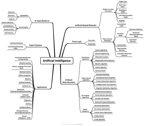 Significant scientific progress has been made in the field of AI over the past ten years, which is defined as “a system’s ability to properly interpret external data, to learn from that data and to use this knowledge learned to accomplish specific objectives and tasks through flexible adaptation” [58]. Algorithms are already becoming able to digitally perform operations that effectively and productively imitate human learning, profound judgment, and decision-making across a wide range of application domains, driven by a rise in data generation and computation power [9,59]. Examples of such business applications include product design, the gathering of limited external knowledge, talent recruitment and screening, and internal business operation optimization [60,61]. The taxonomy of artificial intelligence techniques, however, is not generally agreed upon. The majority of AI techniques are grouped under the headings Fuzzy Logic (FL), Artificial Neural Networks (ANN), Expert Systems (ES), and AI-supported Meta-heuristics (MH) approaches in Figure 2, which also presents the different types and applications of AI [27,50].