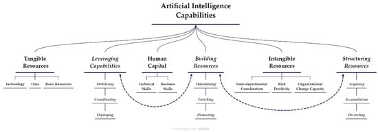The way a company structures its resource portfolio affects the tangible and intangible resources it has, which determines the potential value it may create at any specific time. Data, technology infrastructure, and people skills and expertise, as well as other intangible resources such as a culture of learning and initiative, are examples of such resources as aforementioned [81]. This procedure is crucial because it gives businesses the resources they need to develop new capabilities. This means that, in the context of AI, the types of AI-based capabilities that a company can develop (such as developing NLP tools, intelligent assistants, and forecasting) strongly depend on the data, infrastructure, competences, and other relevant resources that are widely obtainable [14].