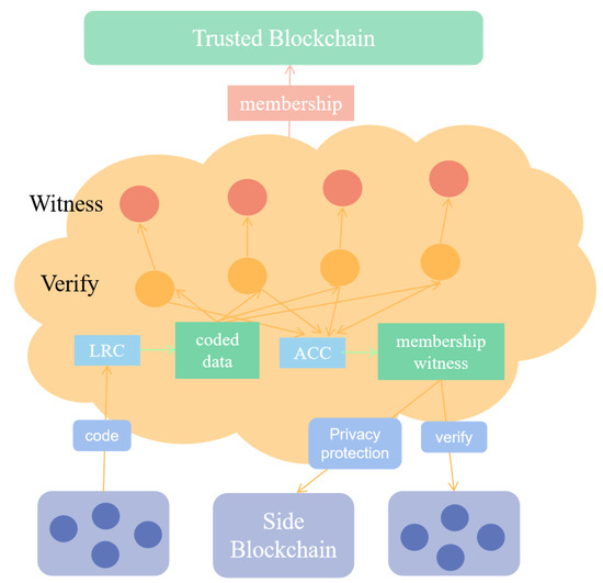 The system consists of four parts: trusted blockchain (proof of storage block), client (node providing data in side blockchain), zero knowledge accumulator, and intermediate verification layer to ensure data availability. The system structure is shown in Figure 1.