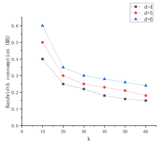 We can calculate the amount of bandwidth consumed by the nodes during the encoding process. The bandwidth consumption of the node is determined by evaluating the bandwidth consumption of the d encoding fragments stored by each node. The bandwidth consumption of the node during encoding varies for k = 10, 20, 30, 40, 50, 60, and d = 4, 5, 6, where k denotes the total number of encoded fragments. Figure 3 shows the change in bandwidth consumption when the encoding fragments are stored during encoding. When d is fixed, the larger k is fixed, and the less bandwidth is consumed for storing the encoded fragment during encoding, and when k is fixed, the larger d is, and the greater bandwidth is consumed for storing the encoded fragment during encoding. Therefore, the size of bandwidth occupied by nodes for data transmission is related to the amount of encoded data allocated to nodes for storage. When the block size is relatively large, the bandwidth occupation and the amount of stored data can be measured to choose a better solution, but with the current block size of the mainstream blockchain, the bandwidth occupied by data transmission between nodes within a group is small.