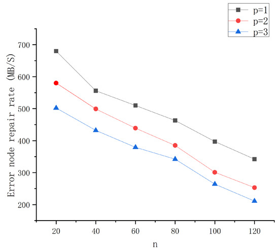 In the experiments, the repair rate of erroneous nodes was calculated and the total encoded data volume of the nodes was evaluated at the number of erroneous nodes p = 1, 2, 3, respectively. n = 20, 40, 60, 80, 100, 120 is the repair rate of the erroneous nodes. Figure 4 shows the variation of the repair rate of the error nodes. We can know that when p is fixed, the larger n is, and the slower the repair rate of the error nodes in each slice, and when n is fixed, the smaller p is, and the faster the repair rate of the error nodes.