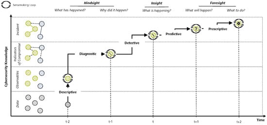 As described above, we consider security analytics as big data analytics from a cybersecurity perspective, distinguishing between analytical operations, namely, descriptive, diagnostic, detective, predictive, and prescriptive [3,15]. We define all analytical operations as , whereby holds the respective results of one analytical operation (generated knowledge). Additionally, analytical operations O yield subsets, i.e., analytical operations categories: . We consider all analytical categories, as we provide an approach to holistically integrating security analytics. Digital-twin-based security analytics involves knowledge and bidirectional communication with the physical environment.