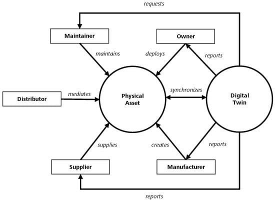 Collaboration between lifecycle participants must be strengthened, as this will improve observables and indicators of compromise through external knowledge [4]. For example, the greater the knowledge about indicators of compromise, the more efficient security analytics. To promote collaboration among lifecycle stakeholders, we must first understand their roles in the Industrial IoT. We summarize the leading roles in Industrial IoT: manufacturer, supplier, distributor, maintainer, and owner (see Figure 2). Since digital twins promote knowledge sharing in the Industrial IoT, we illustrate their bidirectional communication with their physical counterparts. A physical asset consists of several components from multiple suppliers assembled by a manufacturer. A distributor brokers the asset to an owner, who contracts a maintainer to provide services and maintenance. Digital twins communicate bidirectionally and serve as a single point of truth, eliminating information asymmetry. For example, they notify an owner if an incident occurs or report vulnerabilities to a supplier or manufacturer. Given this knowledge generation and sharing notion, we can define the key requirements.