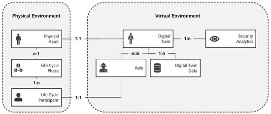 We denote the primary entities and their relationships using an entity-relationship model (cf. Figure 3) in preparation for the formal model. Gray-colored blocks and dashed lines represent the logical components. Here, we represent the physical environment and the virtual environment as the main components in Industrial IoT. It should be noted that the lifecycle participants and the digital twin data can be mapped to both the physical and virtual environments. However, this plays only a minor role. Furthermore, we define security analytics as an internal component of the virtual environment [23]. The digital twin can be either in one of the three modes of operation: simulation, replication, or analytics.