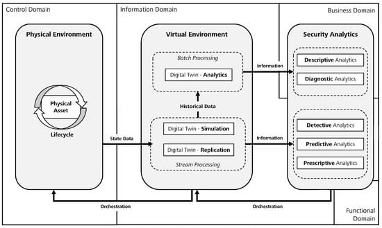 Information Domain. The information domain is responsible for data acquisition, processing, and persistence. The physical environment feeds the respective digital twins with data and receives data and commands from the digital twins. Digital twins thus claim bidirectional communication with the physical environment. Technically, bidirectional communication is realized by so-called event-based messaging platforms that rely on hubs or brokers based on publish/subscribe messaging. However, the information domain includes historical, state, and semantic data. The use of different data stores manages the diversity of data. The digital twin in analytics mode processes historical data in a batch-processing pipeline. Digital twins using replication and simulation modes rely heavily on real-time data in a stream processing pipeline. Each pipeline supports different analytical operations. Descriptive and diagnostic operations are coupled with the digital twin’s analytics mode to provide hindsight. Detective operations are time-dependent and should be coupled with the replication mode. The digital twin constantly feeds detective operations with real-time state data. Predictive and prescriptive operations build on both simulation and replication modes. Both modes of operation are the foundation for predicting incidents or recommending incident response operations.