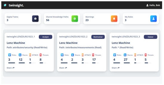Digital twins take security analytics to a new level in knowledge generation and sharing. As shown in Figure 6, our Twinsight UI leverages security-related knowledge from digital twins to inform security professionals and enable knowledge sharing. The user interface integrates device representation (digital twin) and highlights current threats, potential attacks, and granted shares. We believe system-of-systems alerts would lead to more intuitive interaction with Wazuh security analytics software by reducing complexity through digital twins. The alerts would point directly to a system-of-systems component and help understand the big picture and impact of threats and incidents.