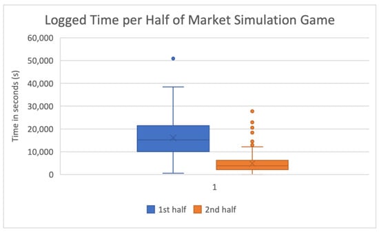 Box plot of logged times for the first and second halves of the market simulation game.