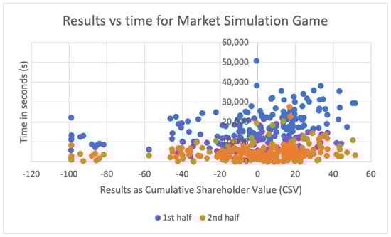 Scatter plot of result at end of round 4 (x) vs time logged in the two halves of the market simulation game (y).