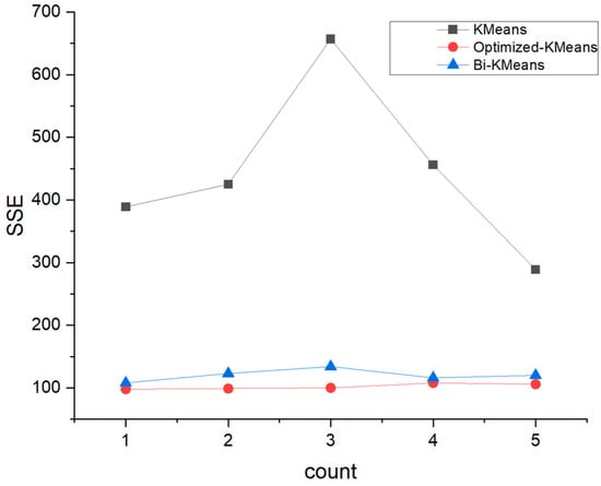 To measure the stability of the clustering algorithms, they are evaluated by the clustering criterion function (SSE, sum of the squared error), and a comparison of the Bi-KMeans algorithm for outlier point optimisation with other clustering algorithms is shown in Figure 1.