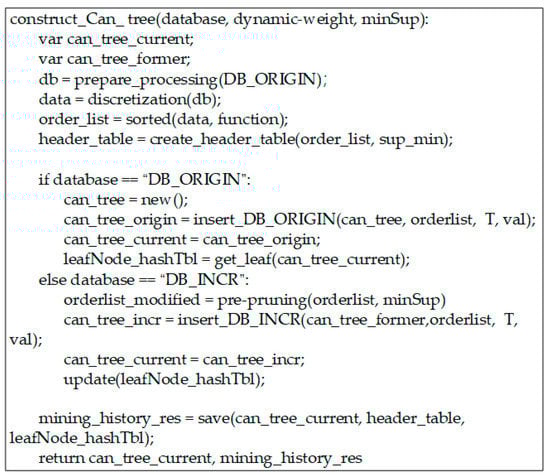 The improved Can-Tree incremental mining algorithm based on dynamic weights for frequent pattern tree construction is divided into two parts: the can-tree construction of the initial transaction database (DB_ORIGIN) and the incremental database (DB_INCR). The construction processes and pseudo-code are as follows.