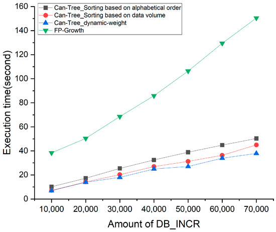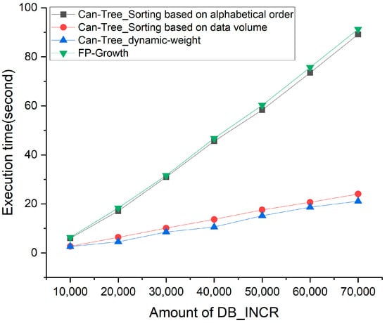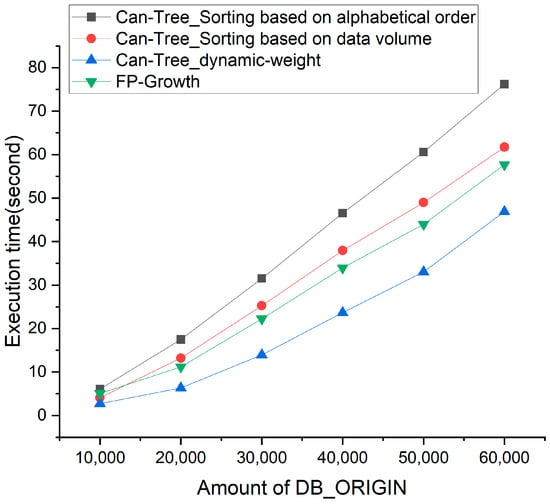 In the construction stage of a frequent pattern tree, DB_ORIGIN and DB_INCR construction time efficiency comparison experiments are conducted, respectively, based on the same support and data volume. Figure 7 shows that in the DB_ORIGIN tree building phase, the Can-Tree method in this paper outperforms the Can-Tree method based on alphabetical order and data volume sorting, but takes more time compared with FP-Growth in terms of time efficiency. This is due to the fact that the Can-Tree algorithm is designed based on incremental data mining, which requires the construction of a full volume frequent pattern tree for the first time. The DB_INCR tree building time is shown in Figure 8. With the increase in incremental data, the time consumption of the dynamic-weights Can-Tree algorithm in this paper is much less than that of FP-growth, and it also outperforms other Can-Tree algorithms in terms of time efficiency. In the incremental mining phase, the introduced strategy of weighted-support-level pre-pruning can filter out data items smaller than the threshold value, so that they can avoid participating in the tree construction process and reduce the size of the final Can-Tree, which in turn improves the efficiency of the mining phase.
