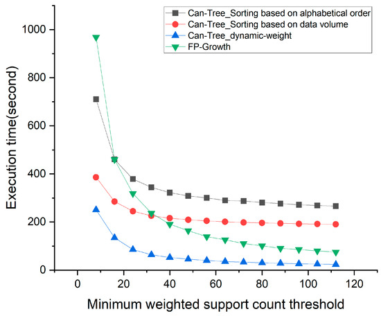 The above experimental results are all conducted under a single minimum weighted support count, so the mining time efficiency of various algorithms under different support degrees is added as a comparison. The experimental results are shown in Figure 11, with the change of minimum weighted support, the mining time of the improved Can-Tree algorithm in this paper is less than other algorithms.