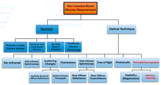 - Alsunaidi, B.; Althobaiti, M.; Tamal, M.; Albaker, W.; Al-Naib, I. A Review of Non-Invasive Optical Systems for Continuous Blood Glucose Monitoring. Sensors 2021, 21, 6820. [Google Scholar] [CrossRef]