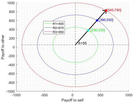 This study comprised several stages. First, we have measured the SVO of the player using the “slider” method [10] and categorized it as “prosocial” or “individualistic”. The SVO slider method describes the player’s preferences about how to allocate resources (e.g., money) between herself and another person [12,22]; a “prosocial” player aims to maximize the total profits of both players while an “individualistic” player aims to maximize only his own profit (see Figure 1 for a basic description of the “slider method”). Figure 1 displays the effect of the two main parameters of the slider method: radius and angle size. It can be seen that as the radius increases, the magnitude of the total resource to be allocated between the two players increases as well. The angle size determines the difference between the payoff to oneself and the payoff to the other player. The difference between angles affects the difference between two allocation alternatives. For example, given the two allocation alternatives: [230,330] → = 55, and [385,105] → = 15, the value of will be 40.