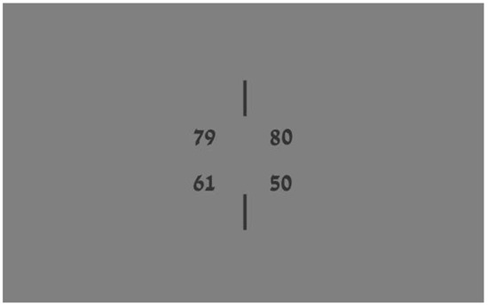 Figure 3 describe the outline of the resource allocation session. The stand-by slides contained the two vertical lines only to focus the gaze of the participants onto the middle of the screen. In the resource allocation problem shown in Figure 2 and Figure 3, the player can choose between two options. In this case, the option on the left side of the screen means that one player will receive 79 points while the other player will receive 61 points. According to the other option, one player will receive 80 points while the other one will receive 50. In the first option, there is a gap of 18 points, whereas in the other option, there is a gap of 30 points. Noteworthily, the increase for the first player is by only one point, while the other player, should they lose significantly, has a payoff decrease of 11 points.