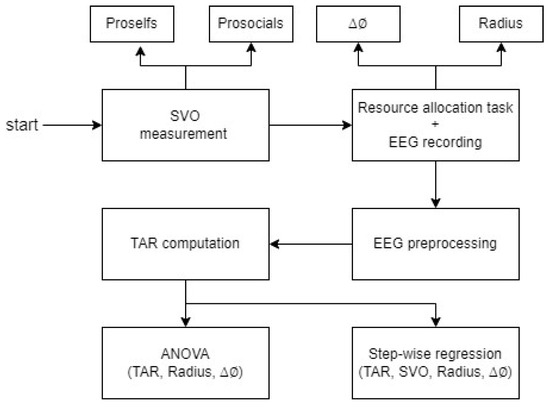 Figure 6 presents a summary of the experimental design stages. Following the SVO measurement stage that was used to label participants into proselfs and prosocials, participants were engaged in the resource allocation task while EEG was simultaneously recorded from the scalp. In this task we systematically varied both the radius size and . In the following stages, we preprocessed the EEG signals, computed the TAR values, and used multivariant ANOVA analysis to study the interactions between these variables. Lastly, we have also run a step-wise regression model to evaluate the contribution of each of these three variables.