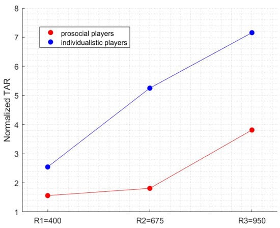 Figure 8 displays the interaction between radius size and SVO (prosocial, individualistic) (F(174,2) = 7.86, p < 0.0001). It can be seen that TAR increases dramatically for individualistic players while for prosocial players a more pronounced increase can only be seen between R2 and R3. This finding highlights the impact of SVO on the perception of the magnitude of the reward (attractiveness). It seems that individualistic players are more sensitive to the effect of the magnitude of the reward compared to prosocials.