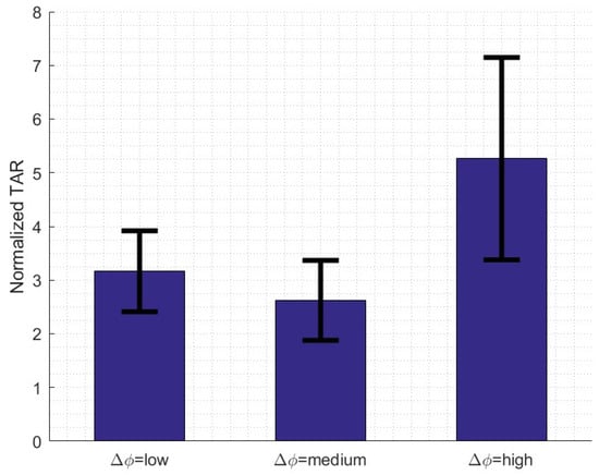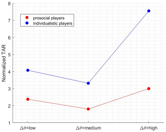 Figure 9 displays the effect of the angle difference between a pair of alternative choices. Since smaller differences between alternatives increase uncertainty between choices, the angle difference reflects the amount of conflict the player faces. When is higher, the perceived difference between low and high reward magnitude is more pronounced. In the smaller and higher values of , TAR is larger compared to the medium sized , thus when conflict and attractiveness come into play, TAR increases accordingly.