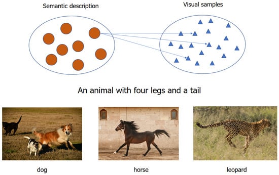 In the early days, the GZSL task was considered a visual semantic embedding problem [6]. Much work on GZSL maps visual features of the image to the semantic space based on attribute methods to realize knowledge transferring from seen classes to unseen classes. However, when the sample points are projected from the original space to the embedding space, the discriminative information in the original space is likely to be lost, which was pointed out in [3]. The phenomenon has been mentioned in [7,8,9] as the hubness problem, which will significantly reduce the diversity of visual features of seen classes since high-dimensional visual features are compressed into a low-dimensional semantic domain [3]. To alleviate the hubness phenomenon, some work [7,8,9] tries to map semantic descriptions of unseen classes into the visual domain. But, this also resulted in another problem called domain shift. As shown in Figure 1, “An animal with four legs and a tail” can be mapped to many animals, e.g., dogs, leopards, and horses. In contrast, those animals have other discriminative information from which we can distinguish them. In addition, the discriminant information in the picture can also be related to its corresponding semantic description. How to make good use of the discriminative information is the key point of our experiment. Some visual features are similar in the semantic domain while different in the visual domain, information from semantic descriptions are prone to shift when mapped to higher dimensional visual space. To solve the above problems, some papers [3,10,11] proposed mapping semantic information and visual features into an identical latent embedding space to make connections between different modalities.