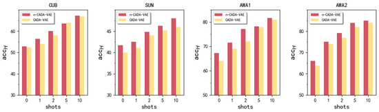 Generalized Few-Shot Learning. The same experimental steps were taken on the generalized few-shot learning as in [11], we increase the proportion of seen classes by transferring unlabeled samples to labeled, i.e., zero, one, two, five, and ten shots. The result can be seen in Figure 3, which shows our experimental results with the CADA-VAE [11] on all four datasets. And our method outperforms compared CADA-VAE for all the shot settings.